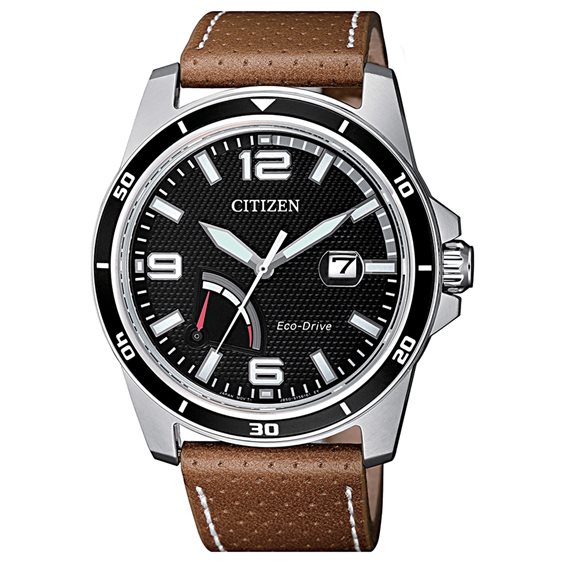 Orologio solo tempo con indicazione di riserva di carica collezione MARINE. Cassa in acciaio spazzolato e lucido, Ø 42mm - spessore 10.5 mm - lunetta nera, ansa 22mm. Movimento Eco-Drive a carica luce con riserva di carica 240gg. Vetro minerale. Quadrante nero lavorazione guillochè con data e indicatore di riserva di carica. Lancette ed index luminosi. Cinturino in pelle marone morbida - chiusura dèployante con pulsanti. Impermeabile 10 bar(10 atm.). Peso 72.7 gr. Prodotto nuovo e originale, munito di manuale di istruzioni e GARANZIA INTERNAZIONALE Citizen di 24 mesi.