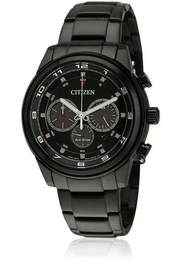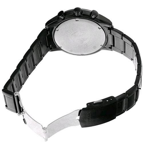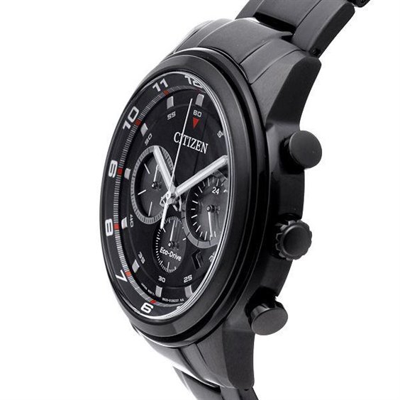 Orologio Citizen con movimento Eco-Drive a carica di luce infinita da uomo . Cassa e cinturino in acciaio brunito e satinato . Cassa mm 44 con quadrante nero , numeri arabi bianchi , sfere fosforescenti , datario tra il 4 e il 5 e quadrantini del crono argentee . Corona a pressione e fondo serrato a vite WR 10 atm . 2 anni di garanzia internazionale .