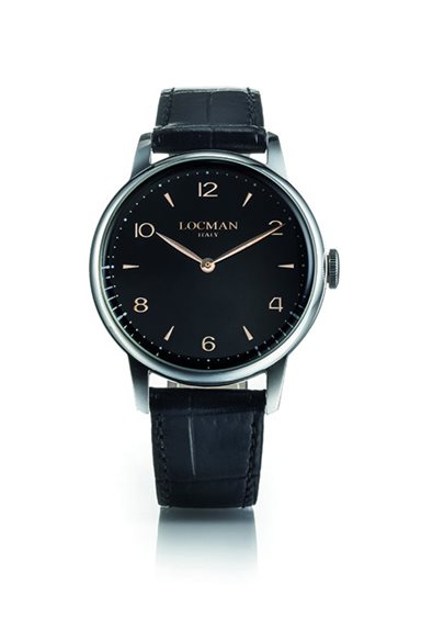 Orologio in acciaio con quadrante nero e indici rosè, cinturino in pelle nera.