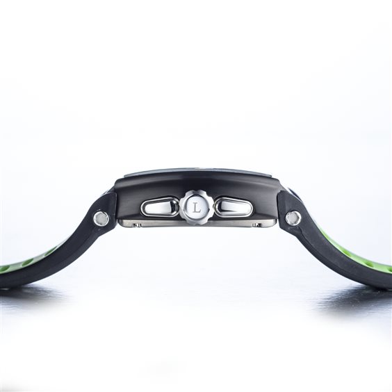 Orologio Locman Tremila. Cassa mm 50 x 38 in acciaio 316L PVD nero, cinturino in silicone nero e verde traforato con chiusura a fibbia. Fondello in titanio con viti, corona a vite. Quadrante nero con indici bianchi e verdi, datario al 3. Movimento cronografo al quarzo. Vetro minerale trattamento zaffiro. Impermeabilità 10 atmosfere. MADE IN ITALY