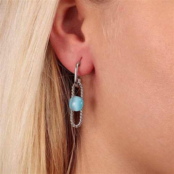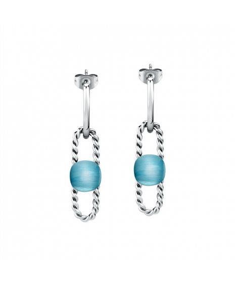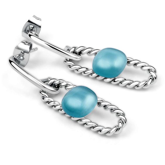 Orecchini donna , acciaio 316L , pendenti cm 4 , elemento con pietra azzurra occhi di gatto. Scatola e garanzia originali.