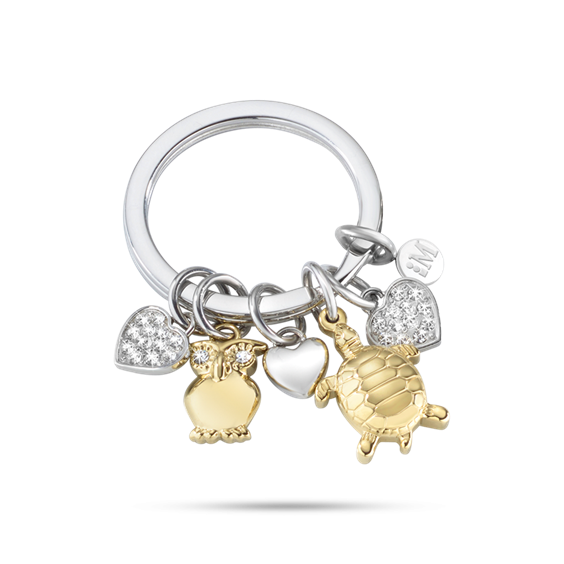 Portachiavi donna in acciaio 316L , lunghezza totale cm 6 , charms con cristalli bianchi e finiture in oro giallo . Immagine indicativa , la confezione può variare di forma e colore.