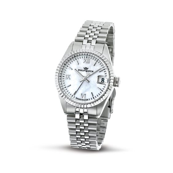 Cassa acciaio inox lucido da 31mm con fondello a vite. Vetro minerale con trattamento zaffiro antigraffio. Quadrante in madreperla bianca con indici e numeri romani applicati e datario ore 3 con lente. Bracciale acciaio lucido e satinato, chiusura a farfalla. Garanzia 2 anni Philip Watch.