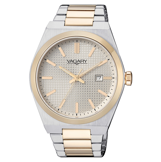 Vagary IB9-239-11 – Orologio solo tempo da uomo in acciaio bicolore con quadrante champagne e datario Un orologio dallo stile classico e raffinato, perfetto per chi cerca eleganza quotidiana. La cassa da 40 mm in acciaio lucido è impreziosita da dettagli dorati, abbinati a un quadrante champagne con indici e lancette in tinta. Il vetro minerale protegge il quadrante, mentre il movimento al quarzo assicura affidabilità e precisione. Il datario a ore 3 aggiunge una funzione utile e discreta. Il bracciale bicolore con chiusura deployante rende questo orologio ideale per ogni occasione, da quella formale al tempo libero. Diametro cassa: 40 mm Movimento: Quarzo con datario Vetro: Minerale Materiale cinturino: Acciaio bicolore (acciaio e dorato) Tipo di chiusura: Deployante Funzioni: Solo tempo, datario Resistenza all’acqua: 5 ATM (50 metri) Genere: Uomo Stile: Classico elegante Un segnatempo sobrio ma distintivo, pensato per chi ama il fascino discreto dell’eleganza tradizionale.