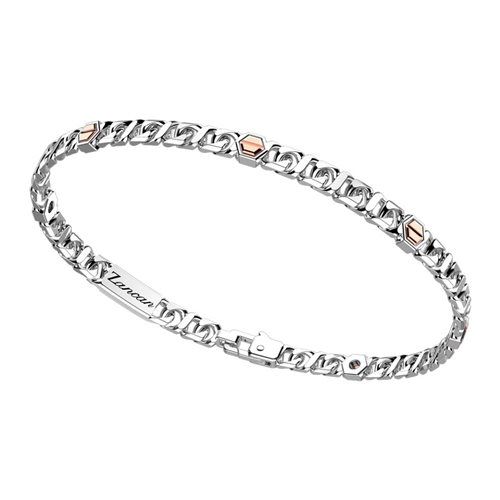 Bracciale uomo collezione ALPHA, argento e oro rosa, maglia morbida intrecciata, inserti esagonali in argento con viti in oro rosa 750 /°°, chiusura a moschettone.